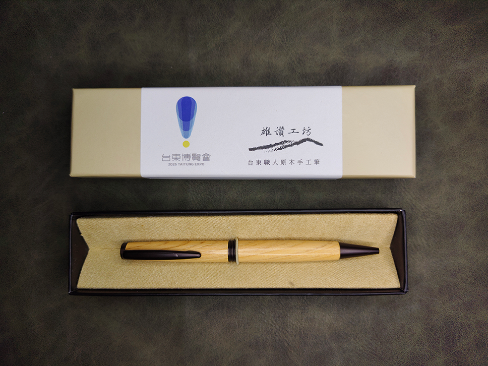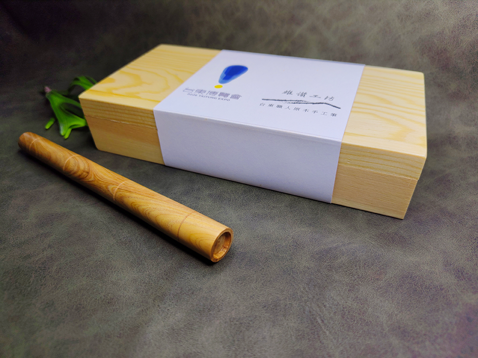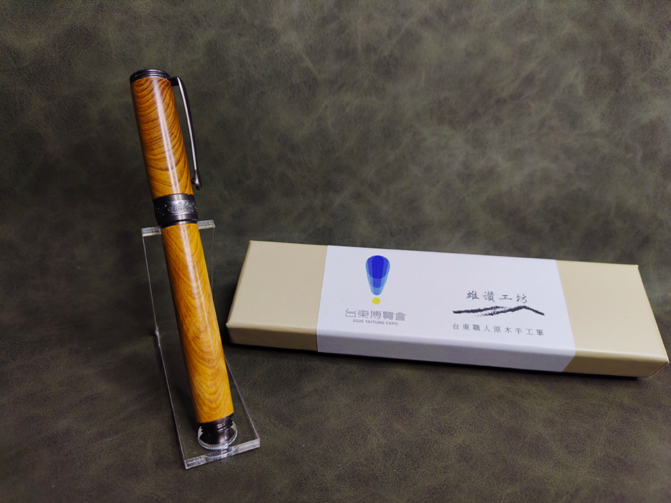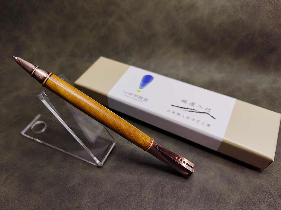 「長於山林、取於海濱」肖楠木鋼珠筆其原木料撿拾於受颱風沖刷至卑南溪出海口延線沙灘之漂流木,透過車削技巧,考量握筆舒適感及書寫流暢度,製作鋼珠筆筆款,採用國際規範筆芯書寫流暢替換方便,筆帽與筆頭採古銅金屬材質,更顯高貴典雅,筆身則使用原木材質製成,保留原木原有特質,堅持手工細磨,不上額外漆飾,藉以突顯其蘊涵的香氣、特殊的紋理,手握的溫潤,展現原木筆之美,形成簡單中帶有耀眼的迷木風采。